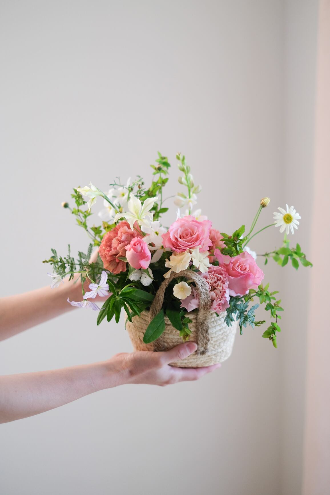 そのまま飾っていただけて、お花が終わった後も、通気性の良いバスケットは小物入れや鉢カバーとしてお使いいただけます