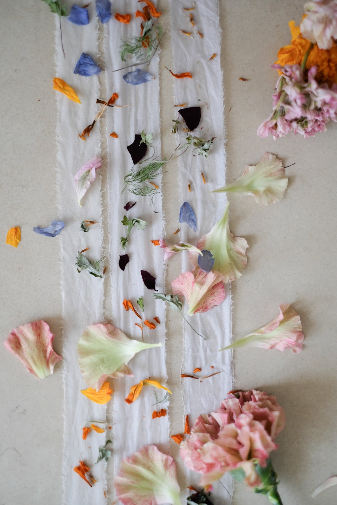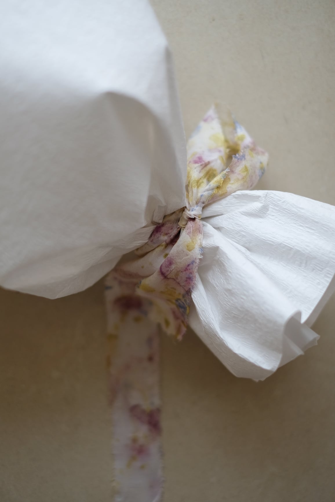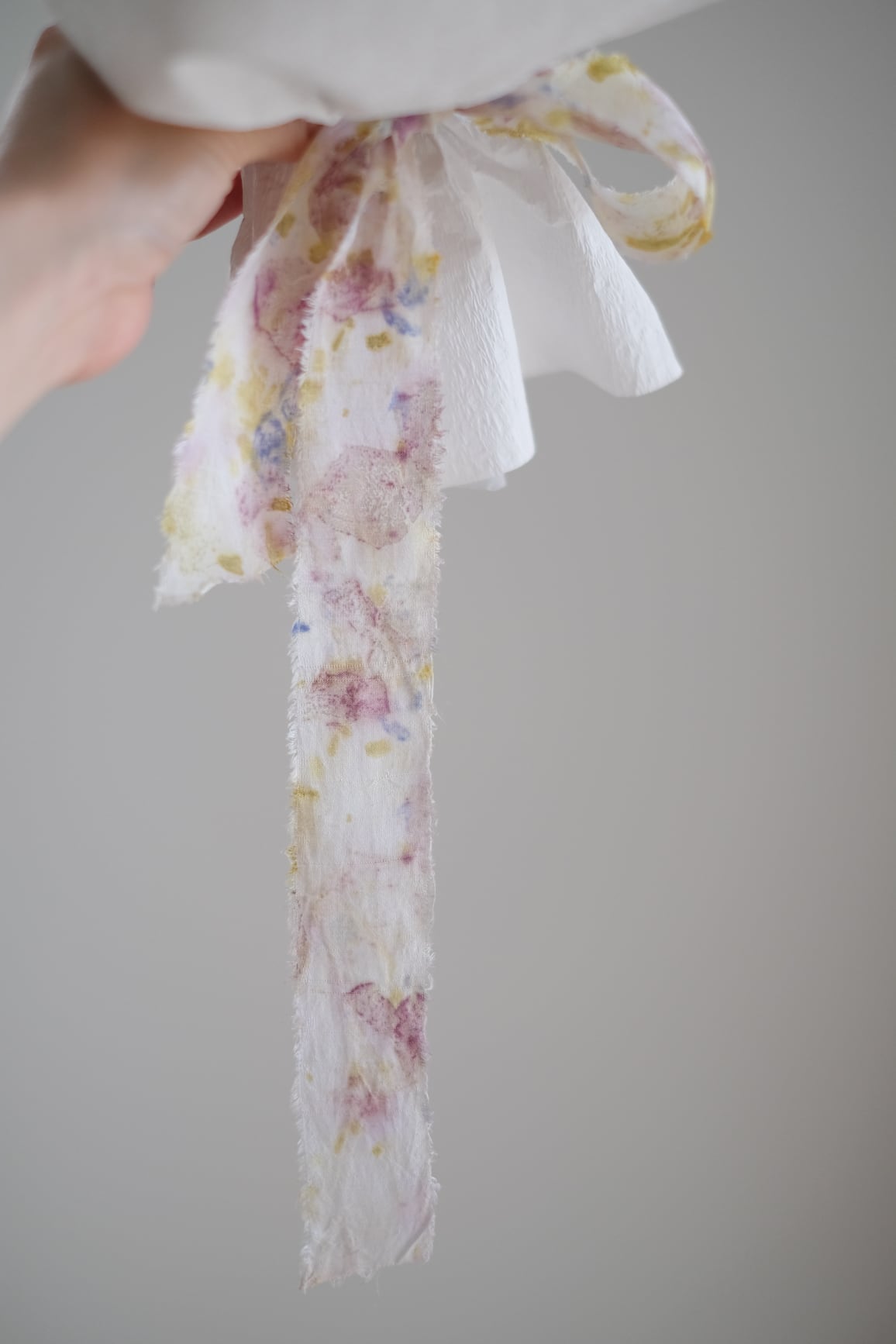 バラやマリーゴールド、ラナンキュラスやヨモギなど...様々な花びらや、葉、花粉などを散りばめて蒸し上げる、バンドルダイと言われる染色方法で染め上げました。植物の足跡のように、一期一会の絵柄をお楽しみください。(染め柄には個体差がございます。)