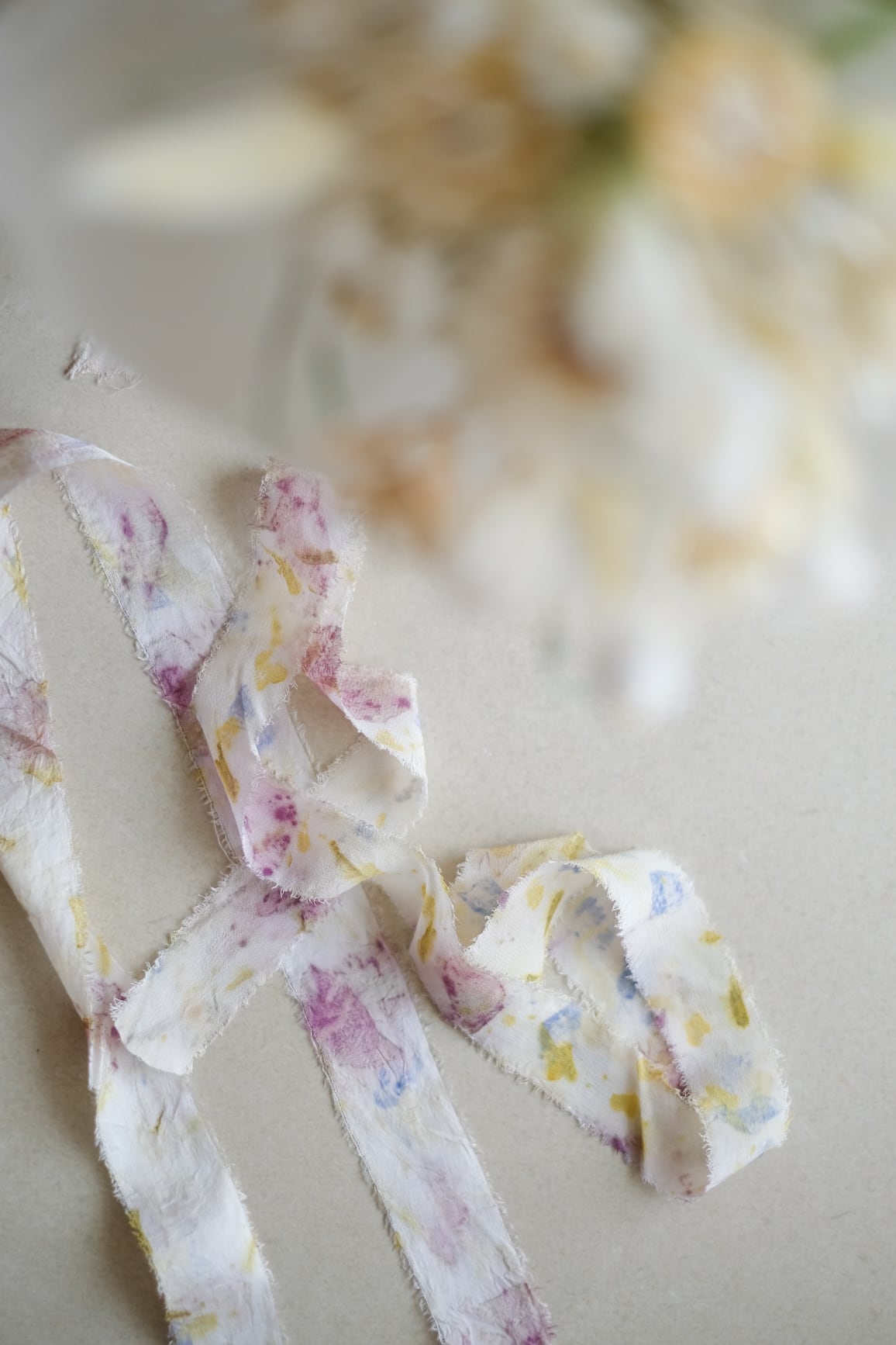 柔らかい風景を感じていただける様なドライフラワーたちを、ぎゅっと束ねて、彩り豊かな植物染めのシルクリボンをあしらいました。